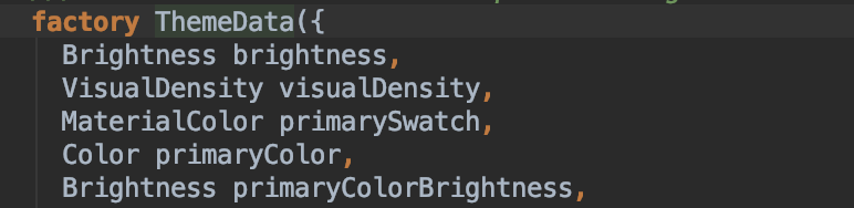 ThemeData를 들어가서 보게 되면 정말많은 테마들을 설정할수 있음을 알수가 있다. 이것은 main.dart에서 다음과 같이 사용을 한다. 다음과 같이 설정시 모든 appbar의 배경색이 deep orange색으로 바뀌게 된다. 하지만 글자들은 아직 아무 변화가 없을것이다.