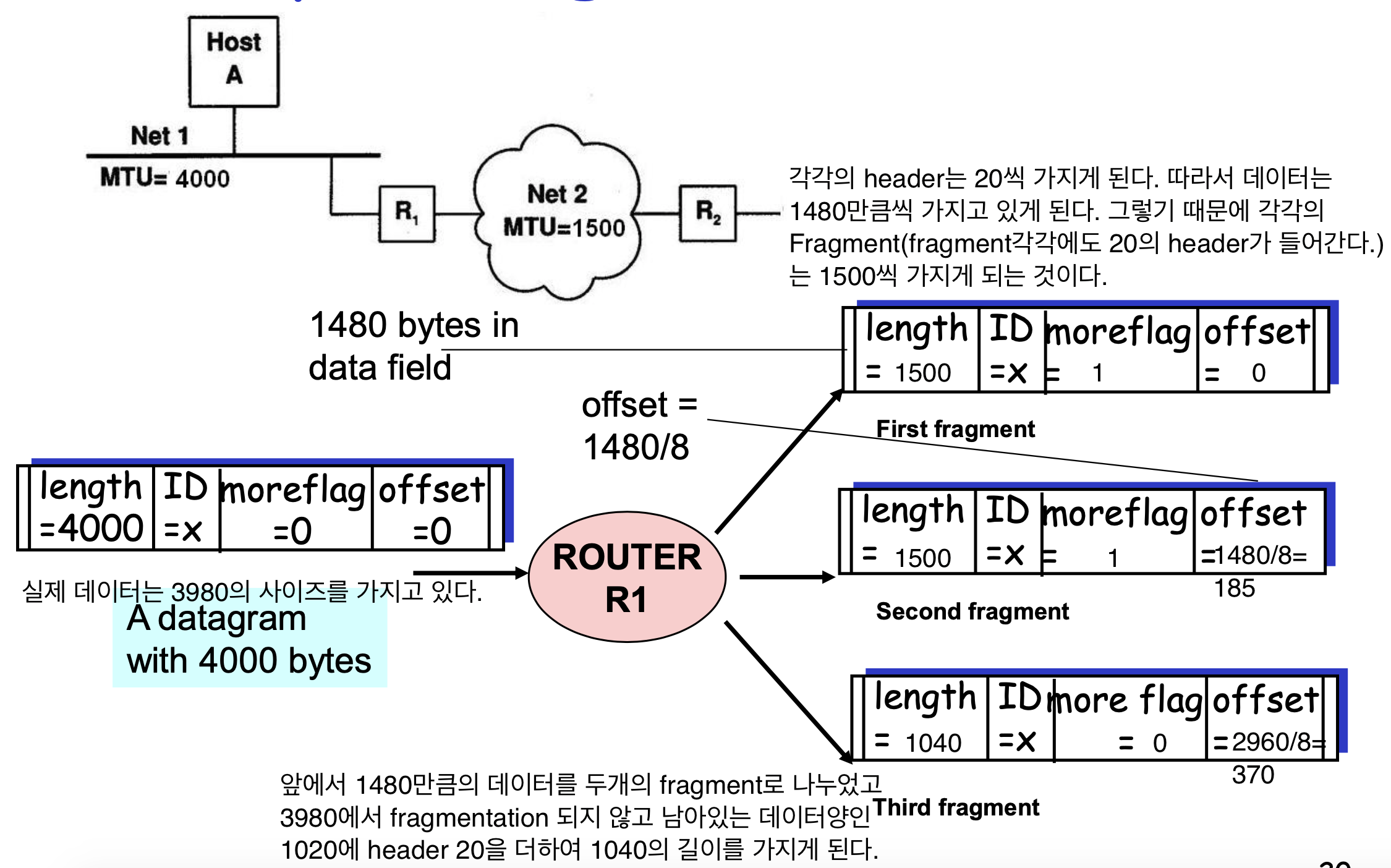 : physical network 마다 다른 MTU를 가지고 있다.(Ethernet ; 1500bytes, FDDI : 4352bytes...)