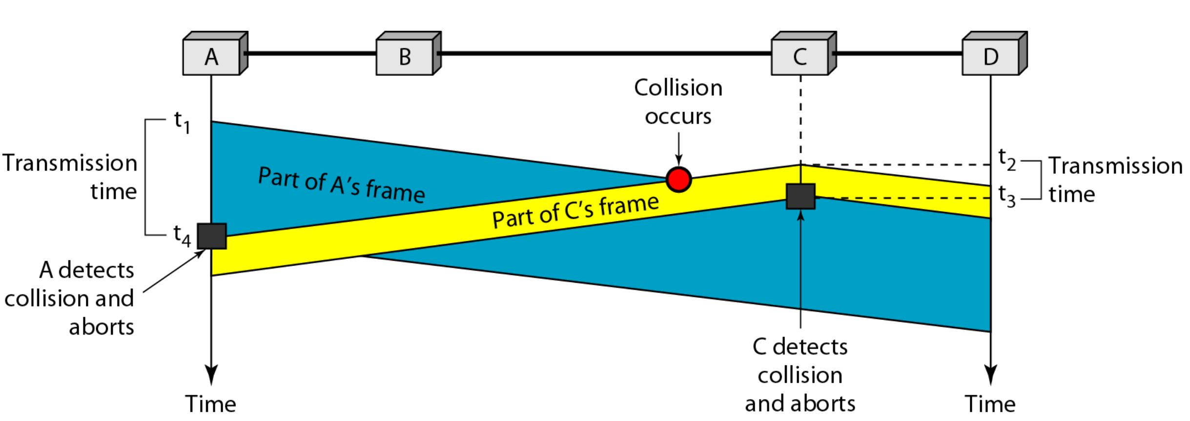 - propagation delay 때문에 처음 carrier sense할때는 데이터가 없다고 느낄수가 있지만 데이터를 보내다가 다른 데이터 해당 channel을 통해 보내지고 있음을 확인할수가 있다. => collision 발생이 가능하다.