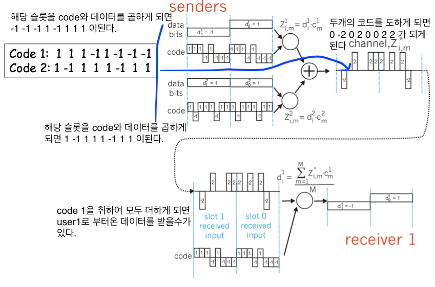 1. sender 측에서 보내는 데이터를 해당 유저가 가지고 있는 코드와 곱하여 encode 과정을 거치게 된다. 2. eoncoding된 데이터가 보내지게 되고 receiver측에 가기전 Decode 과전을 거치게 된다. 3. decode 과정은 한슬롯 안에서의 code와 encoding된 데이터를 곱하여 더하는 과정을 의미하게 된다. 4. receiver 측은 decoding된 온전한 데이터를 전달 받게 된다.