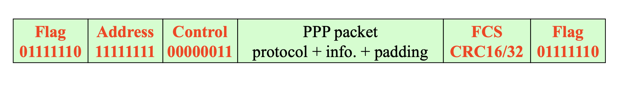 Octet Stuffing ![]() - 이것 또한 01111110를 통해 frame을 구분 짓는다. - 이 경우는 byte 단위의 전송이다 - flag와 flag 사이에는 01111110가 있어서는 안된다. - PPP packet에 01111110가 있게 되면 문제가 생긴다. - sender : 01111110의 데이터가 오게 되면 앞에 control escape octet인 0x7d(01111101)을 붙이도록 한다, 01111110의 데이터는 0x20(0010000)과 xor 시켜 0x5E로 만든다. - receiver : 0x7D가 있으면 뒤의 데이터를 다시 0x20과 xor시켜 원래의 데이터로 바꾸어 준다. |