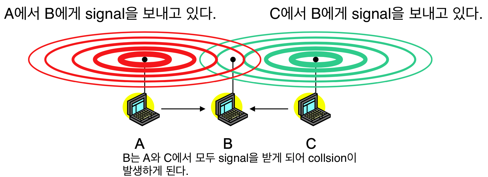 - => A와 C는 서로의 존재를 모르게 되고 A와 C가 B로 동시에 데이터를 보내게 되면 collision이 발생하게 되는 것이다.