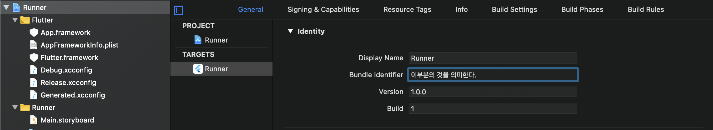 - 앱 등록의 단계에서는 ios 번들 ID은 프로젝트의 가장 처음 부분에서 open ios/Runner.xcworkspace를 사용하여 알수 있다. 해당 명령어를 치게 되면 xcode가 열리게 되는데 번들 ID의 경우 아래사진이 Bundle identifier에 있는것을 복붙을 해주면 된다.
