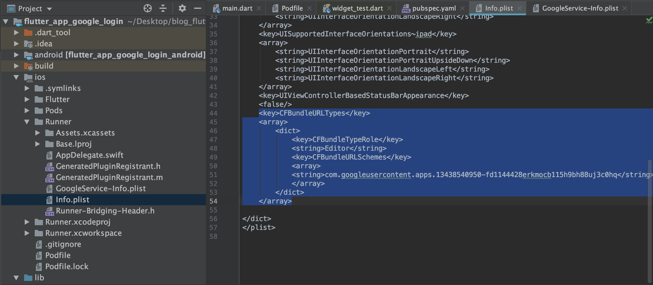 4. 또한 GoolgeServide-Info.plist에서 REVERSED_CLIENT_ID의 key값을 복사하여 Info.plist에 적어야하는데 CFBundleURLTypes부분을 추가해야 한다. 해당 복사한 키값은 여기다 붙여넣어야합니다 에다가 넣어야 합니다. 이 과정은 구글 웹페이지에서 로그인에 성공하면 브라우저 레벨에서 iOS 앱으로 자동 연결되게 하기 위하여 수행하는 것이다.