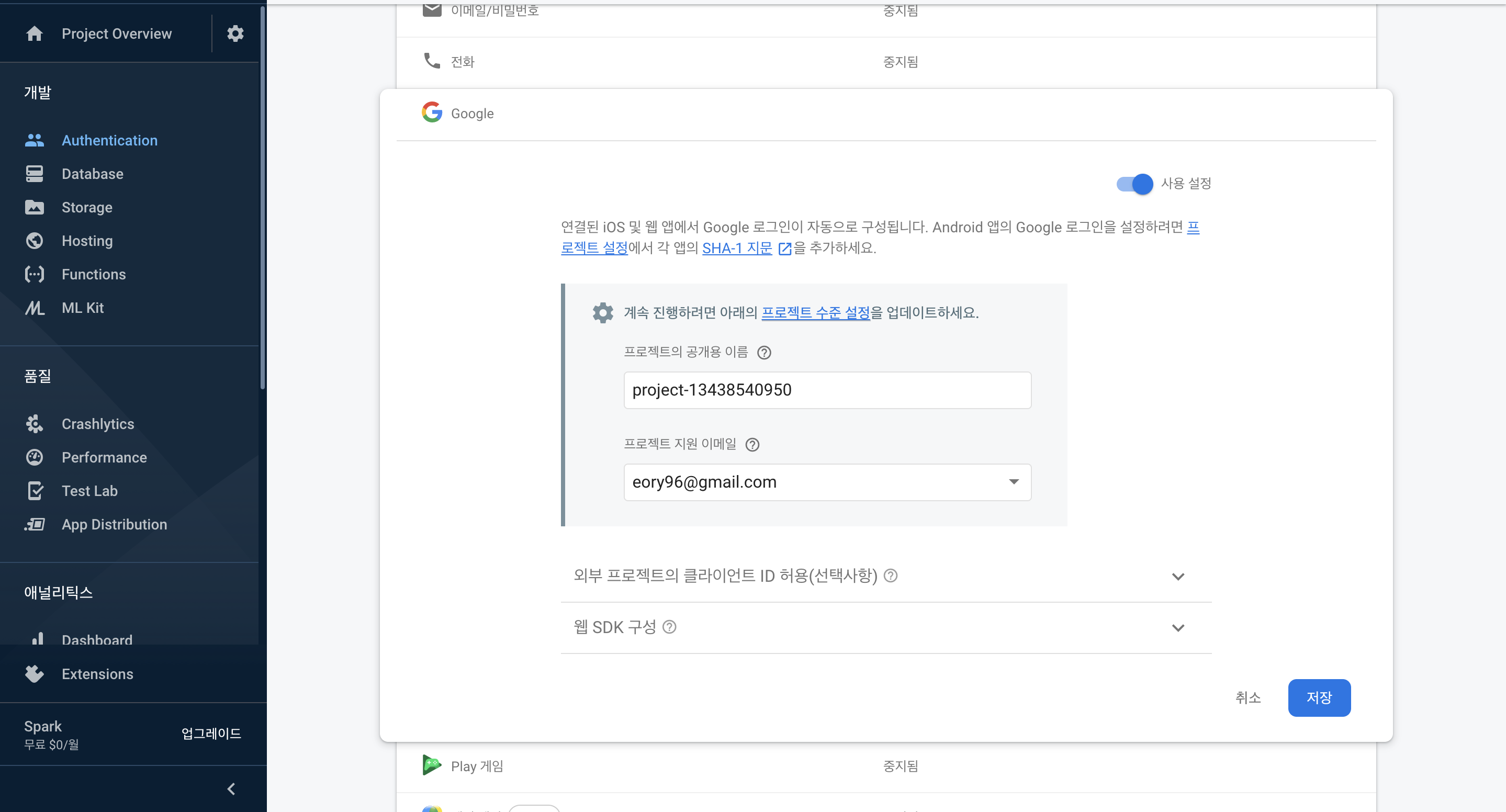 - 그리고 해당 프로젝트의 Authentication부분에서 google과 익명부분을 사용설정으로 체크를 해주어야 한다.