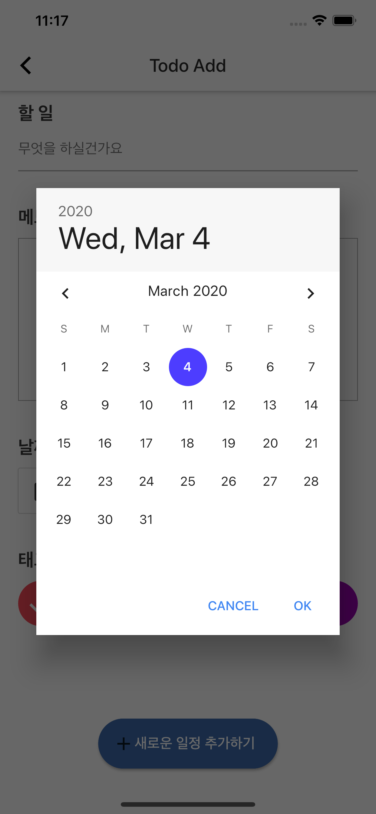 4. todo_bloc.dart 부분에서는 새로이 만들어진 event에 대해 관리하는 것들을 추가해 주어야 한다. 날짜가 변경되는 경우는 date하나를 받아와 바로 state를 업데이트 해주면 되지만 버튼이 눌러졌을때의 상황은 그리 간단하지 않다. 다시금 모델에 받아온 데이터를 넣어줘야 하고 그것을 이미 존재하는 todoList에 넣어주어야 하기 때문이다. 코드를 보면 좀더 쉽게 이해가 될것이다.