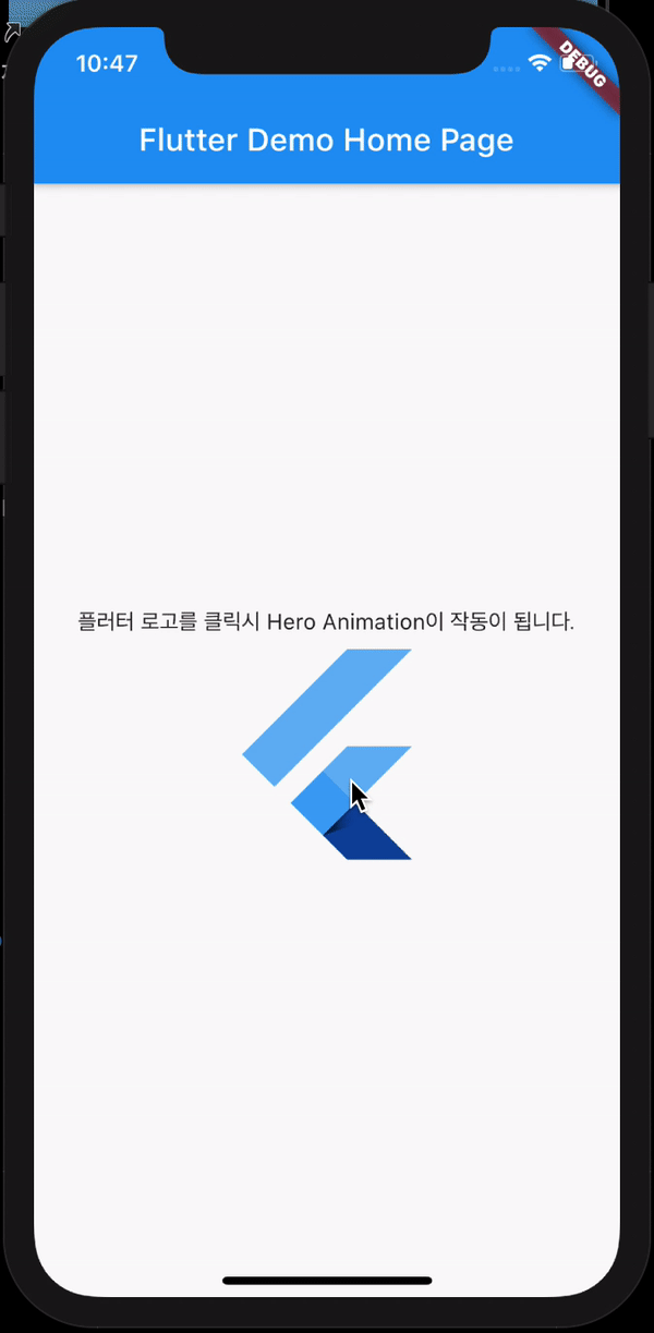 '플러터 로고를 클릭시 Hero Animation이 작동이 됩니다.',