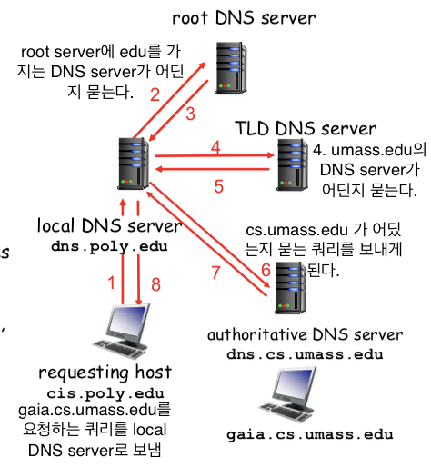 : host 가 DNS 쿼리를 만들게 되면 일단 local DNS server로 보내진다. (프록시 처럼 이용이 되어지고, 이것이 계층적 DNS구조로 쿼리를 보낸다.)