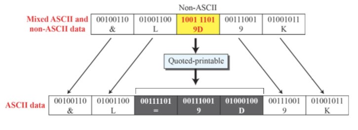=> Quoted-printable : ASCII data와 Non-ASCII data(해당 data의 MSB가 1일때 non ascii가 된다.) 가 섞여있을때 이를 모두 ASCII code로 만들기 위해서 만드는것