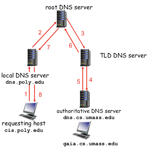 Iterative Queries - 3 에서의 경우 해당 TLD DNS server에 대한 정보를 알려준다. - 5 에서의 경우 해당 authoritative DNS server의 위치를 알려 주게 된다. - 7 에서의 경우 해당 쿼리에 대한 정보가 있다고 Authoritative response를 보내게 된다. - 8 에서의 경우 local DNS server에서 7을 통해 받은 정보를 가지고 gaia.cs.umass.edu의 IP를 찾아내고 그 정보를 local host에게 전달하는 과정이 된다.