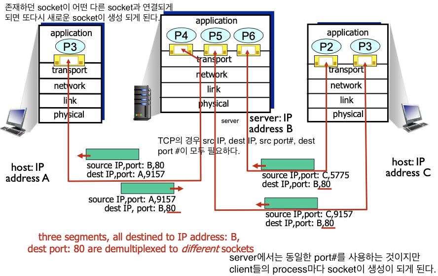 -> Demultiplexing : segment에서의 header정보를 이용해 적절한 socket들로 보내게 된다.